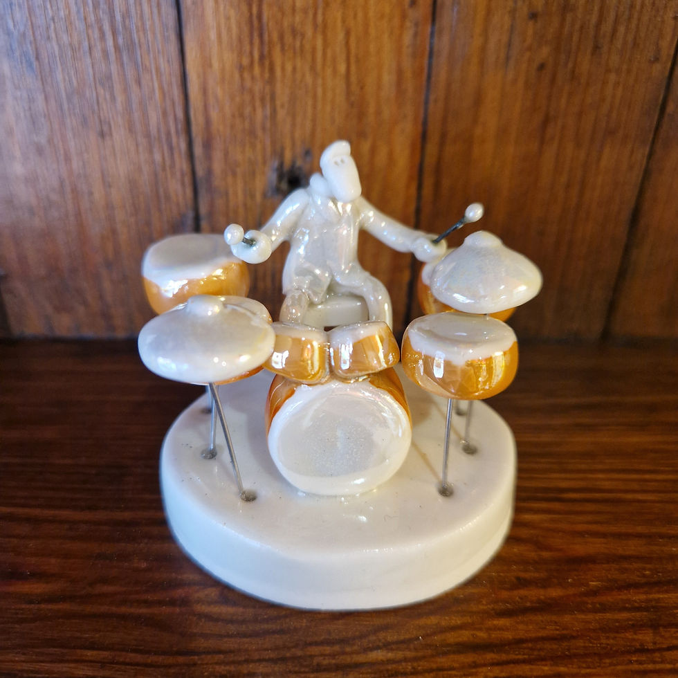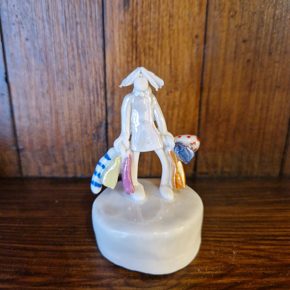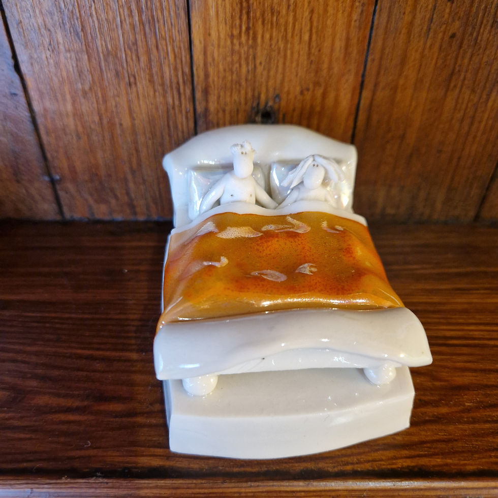 He works in porcelain for the fine detail that can be achieved, lustres and some enamels are used to finish.